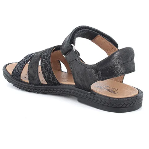 Fin sandal med en overdel af skind med både glimmereffekt og glitter. Sandalen lukkes med velcroremme over forfod og vrist, og hælremmen er polstret for øget komfort. Den åndbare indersål er beklædt med skind og giver et godt fodklima. Den stødabsorberende ydersål er meget fleksibel.