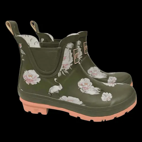 Dejlig Peony Low gummistøvle med en vandtæt overdel af gummi med et flot print, forstærket om fodkanten og åbningen. En trækfane bagpå gør det nemt at træde i gummistøvlen, imens en refleksstribe bagpå øger synligheden. Indvendig har gummistøvlen et blødt tekstilfoer, og indersålen kan tages ud. Den kraftige og stødabsorberende ydersåls mønster leder vandet væk og giver et forbedret vejgreb.