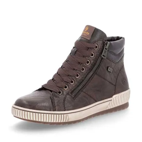 Lækker ankelstøvle med en overdel af glat skind og syntet med en karakterfuld struktur for at understrege det urbane look. Støvlen justeres med brede snørebånd og lukkes med to lynlåse på siderne af snørebåndet. Åbningen er let polstret, og med vidde G er støvlen mere rummelig. Indvendig har støvlen et let foer, og Remonte-Tex-teknologien gør støvlen kraftig vandafvisende. Den udtagelige Remonte-soft-indersål er støddæmpende og komfortabel, og den fleksible gummiydersål er stødabsorberende med et godt fodfæste.
