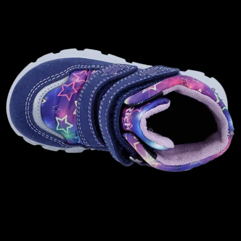 Dejlig og vandtæt vinterstøvle med LED. Overdelen er af syntet og tekstil med refleksdetaljer på snude og hæl og tre stjerner med LED-lys på ydersiden af anklen, der blinker, når støvlen rammer jorden. Støvlen lukkes med to velcroremme, og åbningen er polstret for øget komfort. Indvendig har støvlen et blødt, varmt foer, og sammen med en åndbar, 100 % vandtæt og PFAS-fri Sympatex®-membran holdes fødderne varme og tørre. Indersålen kan tages ud, og den fleksible ydersål er stødabsorberende med et godt fodfæste.
