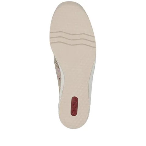 Komfortabel Ready2GO sko med en overdel af syntet i beige kombineret med metalliske farver som bl.a. pink, guld, og sølv i et elegant mønster, der tilføjer et spændende udtryk. Elastikker ved åbningen giver en behagelig pasform, og med Hands Free Ready 2 GO-teknologien med en fast hælkappe kan skoene nemt tages på uden at bukke sig eller bruge hænderne. Den bløde, skindbeklædte indersål med stødabsorbering sikrer komfort hele dagen, imens den fleksible ydersål er stødabsorberende med et fint fodfæste. Med Antistress får du tilmed en meget let sko med mere plads om forfoden. Kilehælen på 4,5 cm tilføjer et feminint og moderne touch.