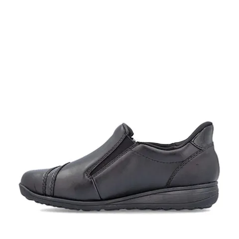 Dejlig sko med tex og ekstra vidde. Overdelen er af glat skind og syntet med lakdetaljer på forfoden og hælen. Skoen lukkes med en lynlås på ydersiden og har en elastikkile på indersiden, og som en Ready2GO-model træder du nemt i skoen pga. den faste hælkappe. Med ekstra vidde er der plads til den bredere fod, og med en vandafvisende RiekerTEX-membran holdes fødderne behagelige. Den udtagelige indersål er polstret, støddæmpende og komfortabel, og den fleksible gummiydersål er stødabsorberende med et godt fodfæste.