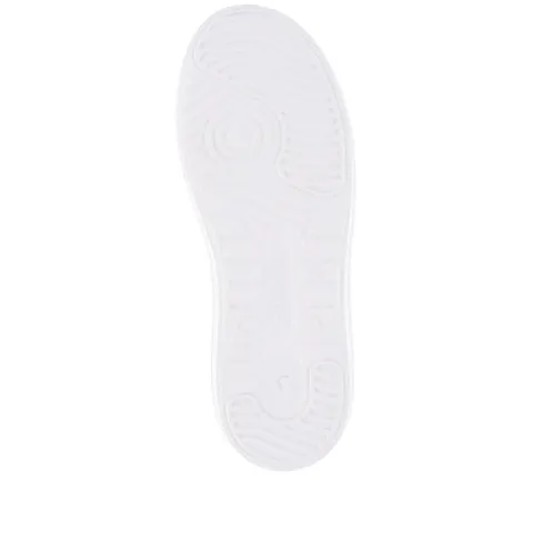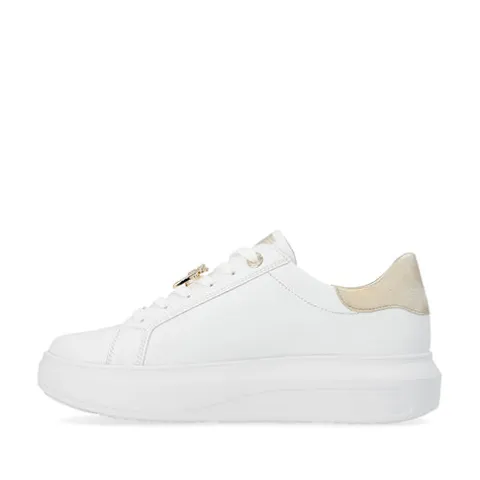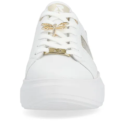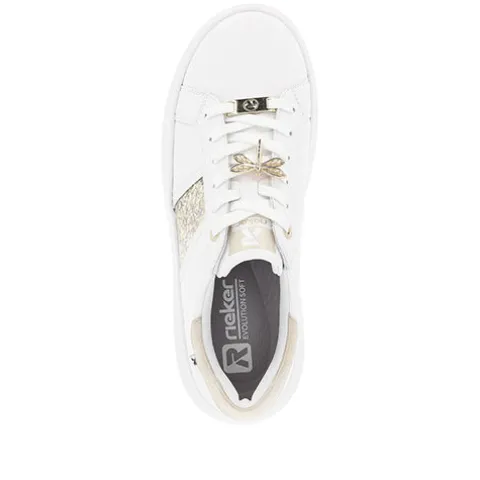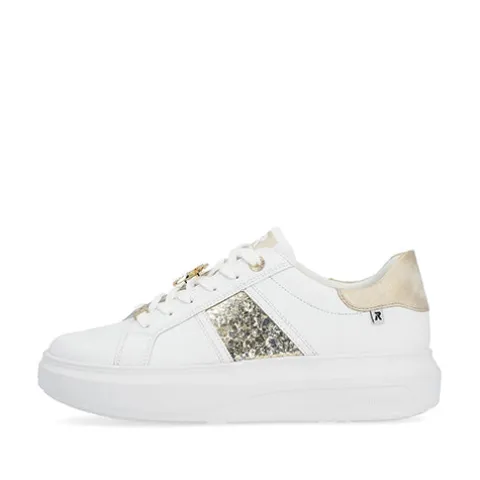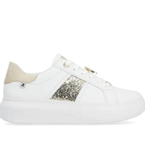 Let og feminin Revolution sneaker med en hvid overdel af glat skind og syntet, dekoreret med guldfarvede detaljer, bl.a. et glitterpanel på ydersiden, guldringe om de to øverste snørehuller, et logo-emblem forneden på snørebåndet og en guldsmed midt på snørebåndet, som kan tages af. Skoen lukkes med snørebånd. Indvendig har skoen et let mikrovelourfoer med Drysport-teknologi, som sikrer åndbarhed og komfort. Den udtagelige indersål er polstret og komfortabel, og den flade, chunky EVA-ydersål er let, fleksibel og stødabsorberende.