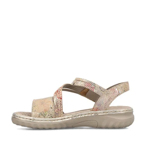 Flot sandal med en overdel af beige ruskind med metallisk print i flotte farver. Sandalen lukkes med to velcroremme over forfod og vrist. Fodsengen en polstret, støddæmpende og komfortabel, og den fleksible ydersål er stødabsorberende med et fint fodfæste.