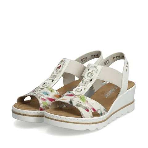 Sommersandal med kilehæl og multifarvede detaljer på vristen. Overdelen er af syntet, dekoreret med udskårne ringe på vristen, og kilehælen giver et feminint look. En elastikrem holder sandalen på plads på foden. Antistress-indersålen giver en fin komfort, og den kraftige ydersål giver et fint fodfæste.