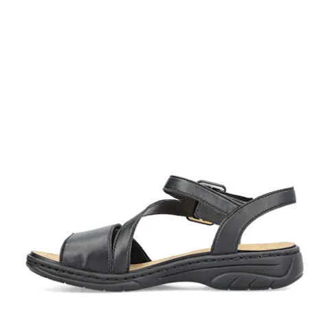 Super fin sandal fra Rieker med pyntespænde. Sandalen har løse indlægssåler og to velcroremme der kan reguleres.