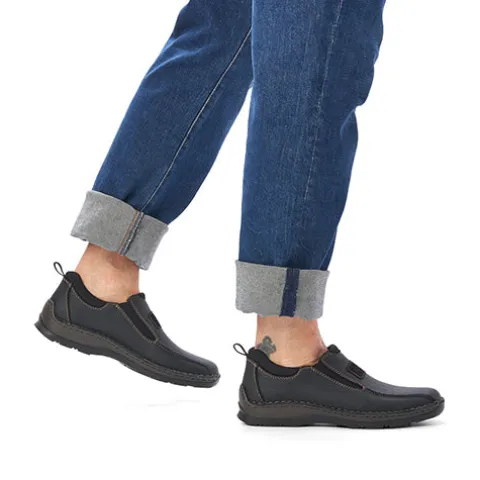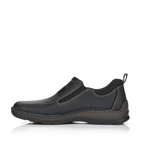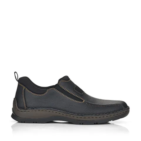 Afslappet sko fra Rieker med elastik i siderne og en god rummelighed. Skoen er designet med brune stikninger. Nem at tage på, og skoen sidder godt på foden. Indvendig er dæksålen i skind, og de bløde og fleksible gummisåler er med stødabsorbering.