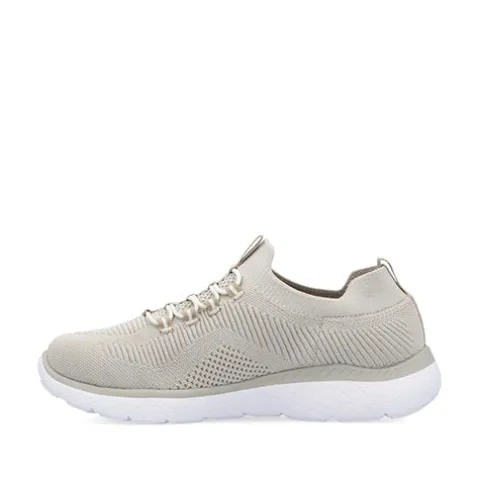 Lækker og komfortabel Rieker Lite Go For It sko af åndbart tekstil med en smule glimmereffekt og smarte refleksdetaljer. Den elastiske åbning slutter til om anklen, og trækfanerne på hæl og pløs gør det nemt at få skoen på og af. Denne slip on-model har en ikke-justerbar elastiksnøre på vristen, som tillader tilpasning til foden i løbet af dagen. Skoen er meget komfortabel med den superbløde, polstrede og støddæmpende Soft-indersål, og den fleksible ydersål er stødabsorberende med et fint fodfæste.