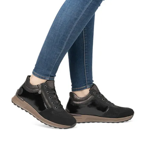 Let og høj sneaker med en overdel af tekstil, lakeret syntet, syntet i nubucklook og i læderlook, udstyret med et let og lunt foer indvendigt. Skoen justeres med snørebånd og lukkes med en lynlås på ydersiden. Den udtagelige Antistress-indersål er polstret og komfortabel, og den ekstra H-vidde giver mere plads om forfoden. Den fleksible ydersål er stødabsorberende med et fint vejgreb.