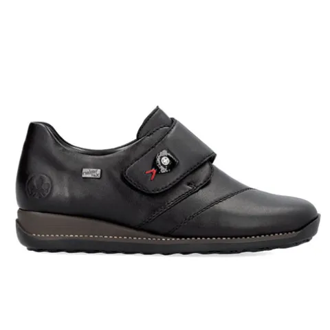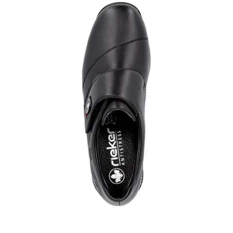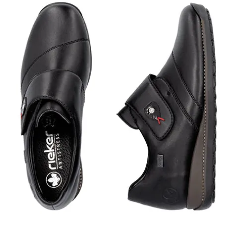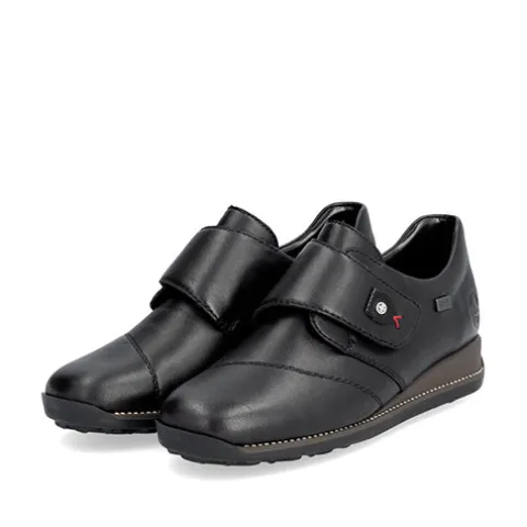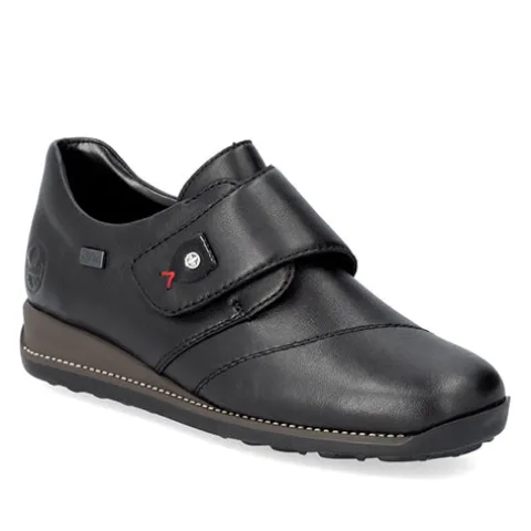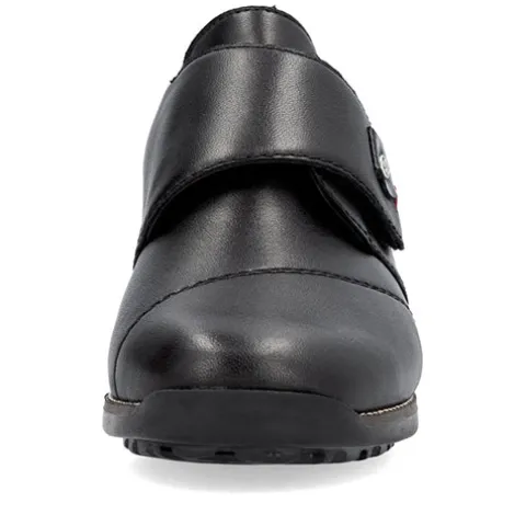 Dejlig og praktisk sko med RiekerTEX og en overdel af glat skind foret med tekstil. Skoen lukkes med en bred velcrorem over vristen, dekoreret med en smart detalje. Den åndbare RiekerTEX-membran er kraftigt vandafvisende og holder fødderne tørre og lune i det almindelige danske vejr. Antistress-indersålen er komfortabel og beklædt med skind, og med et diskret lille løft i hælen øges komforten. Den fleksible og stødabsorberende gummiydersål har et godt mønster, så du har et godt vejgreb.