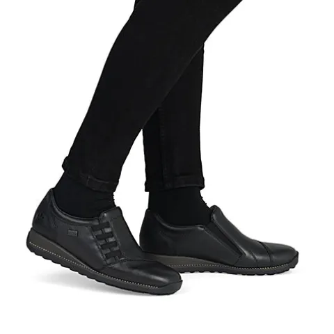 Fin sko med en overdel af glat skind og syntet og elastik i siderne. Skoen er en slip on-model med en smule polstring i insteppet, og indersålen er komfortabel. Med RiekerTEX er skoen kraftigt vandafvisende. Skoen har en lille kilehæl, og den fleksible gummiydersål er stødabsorberende med et godt fodfæste.