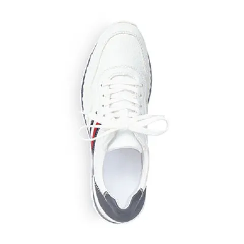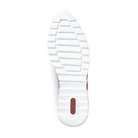 Let og sporty sko fra Rieker med blå og røde detaljer. Sneakeren har en lille kilehæl med grove såler.