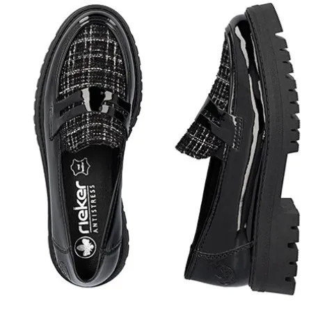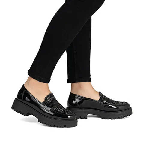 Flot loafer med en overdel af lakeret syntet og tekstil. Elastikkiler i åbningen gør skoen nem at træde i og sørger samtidig for løbende tilpasning til foden. Den komfortable Antistress-indersål er beklædt med skind, og den stødabsorberende gummiydersål giver et godt fodfæste. Ydersålen er chunky med en højde på ca. 3 cm under forfoden og ca. 4 cm under hælen. Disse loafers er perfekte til både hverdag og pænere anledninger.