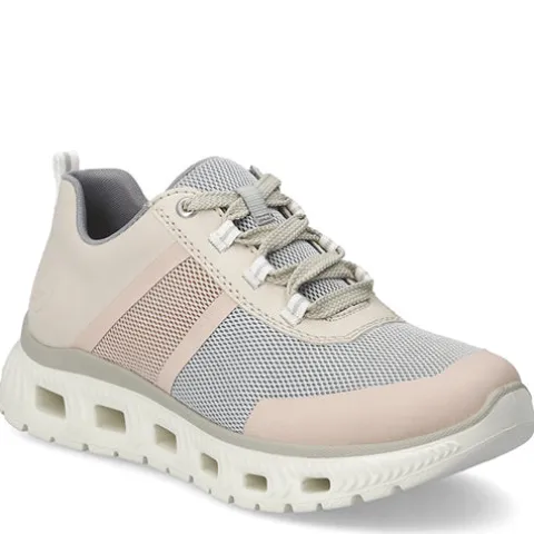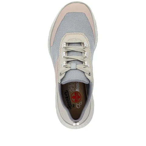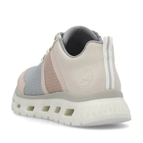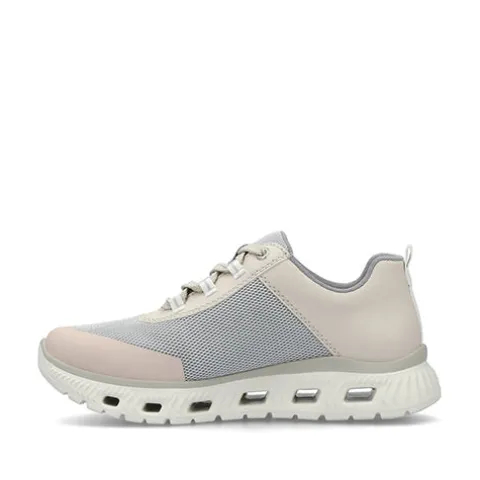 Feminin og meget let Rieker Lite sneaker med en overdel af åndbart tekstil med slidstærke syntetdetaljer på bl.a. snuden, hælen og åbningen. Skoen lukkes med snørebånd, og en trækfane på hælen gør det nemt at træde i skoen. Åbningen er polstret for øget komfort, og Antistress-indersålen er enormt blød og komfortabel. Komforten øges af den ekstra plads omkring forfoden og tæerne. Mellemsålen har tværgående huller, som virker støddæmpende og øger komforten, og ydersålen er fleksibel med et fint vejgreb. Skoen er 100 % vegansk.