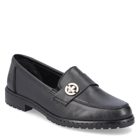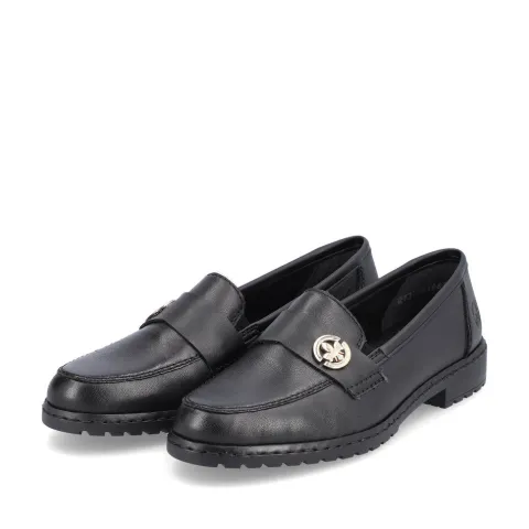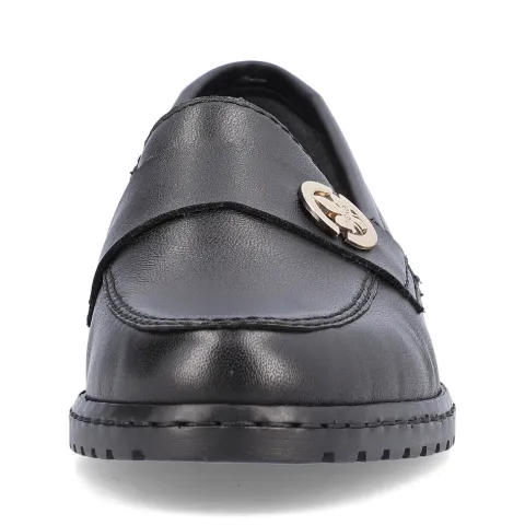 Blød og fleksibel loafer i blødt, glat skind. Skoen har en blød indersål af skind, elastik i begge sider af åbningen samt en flot gulddetalje (Rieker-logo) på remmen over vristen. Her får du et par loafers perfekt til både hverdag og fest.