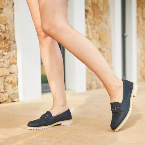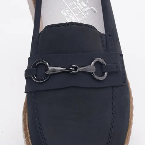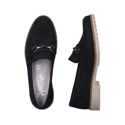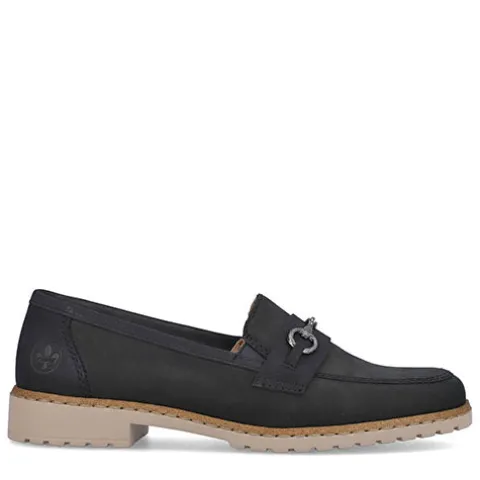 Smarte skindloafers fra Rieker. Skindtypen er nubuck, og skoen har detaljer i syntet samt et smart bidsel henover forfoden. Blød indersål af læder.