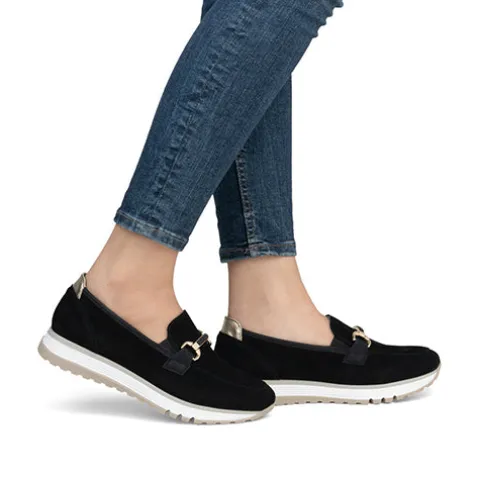 Dejlig loafer med en overdel af ruskind dekoreret med et guldfarvet krombidsel samt en guldfarvet detalje på hælen. Elastikkiler i åbningen gør det nemt at træde i skoen, som med vidde H giver ekstra plads og bevægelsesfrihed om forfoden. Den udtagelige indersål med Antistress-teknologi sikrer maksimal komfort, imens den fleksible gummiydersål er stødabsorberende med et godt fodfæste. Med en hælhøjde på 3 cm får du både stil og funktion. Disse elegante loafers er det perfekte valg til både hverdag og fest.