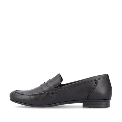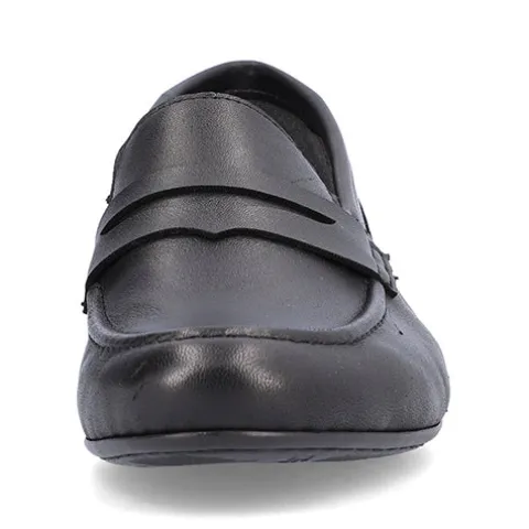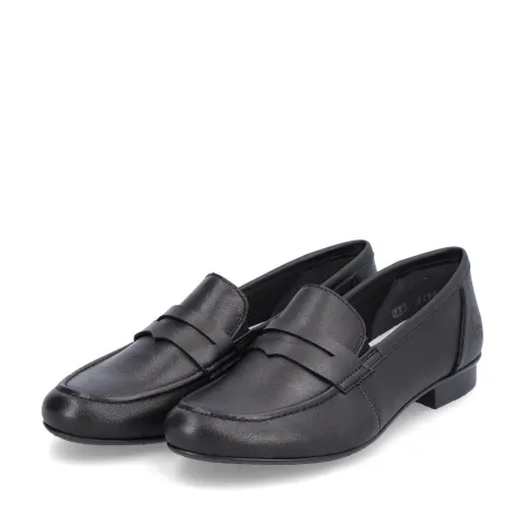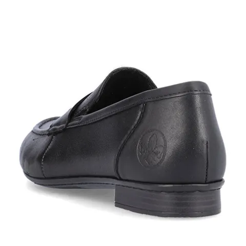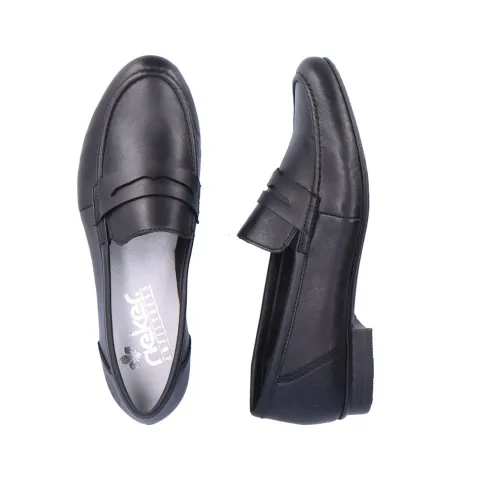 Lækker pennyloafer i blødt, glat læder fra Rieker. Skoen er nem at komme i med elastik på begge sider af åbningen. Den bløde indersål og den fleksible ydersål gør skoen meget komfortabel at have på hele dagen.