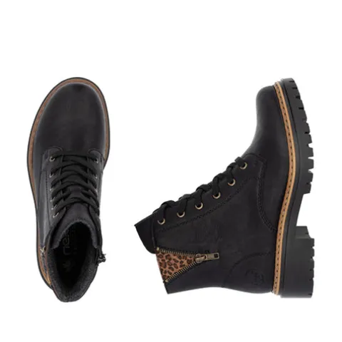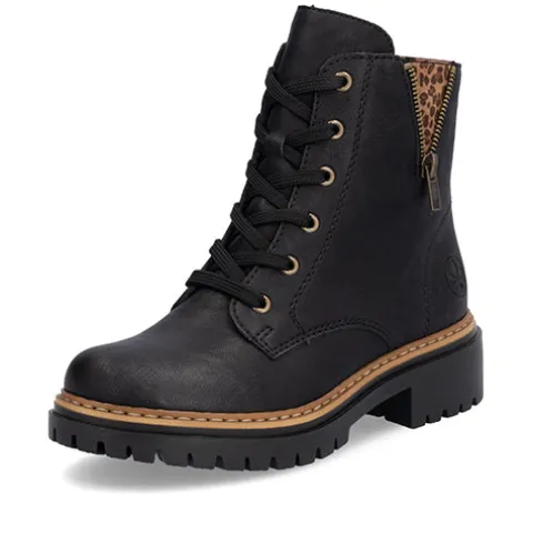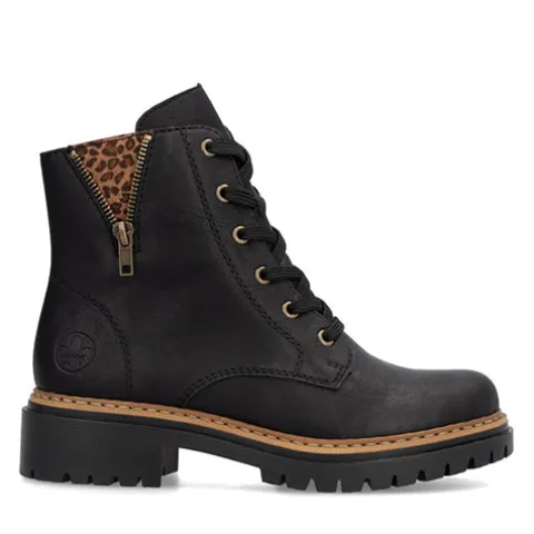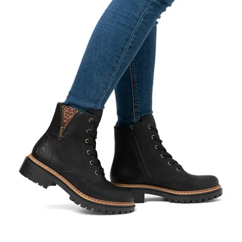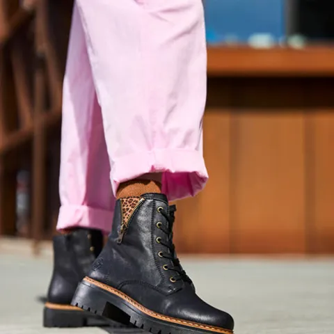 Smart støvle med en overdel af imiteret glat skind dekoreret med en lille, åben lynlås, der afslører leopardprint på ydersiden af anklen. Støvlen justeres med snørebånd og lukkes med en lynlås på indersiden af anklen. Indvendig har støvlen et let, lunt foer. Den kraftige ydersål er stødabsorberende med et godt fodfæste.