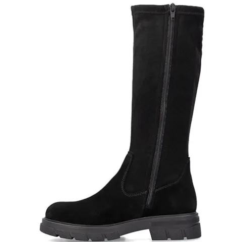 Lækker langskaftet støvle med en overdel af ruskind (foden) og elastisk mikro-stretch-tekstil (Vario-skaft), der sikrer en individuel pasform om læggen. Støvlen lukkes med en lynlås på indersiden af benet. Indvendig har støvlen et let tekstilfoer, og med komfortvidde er der lidt mere rummelighed om forfoden. Indersålen er komfortabel, og den chunky og godt mønstrede gummiydersål er stødabsorberende med et godt vejgreb.