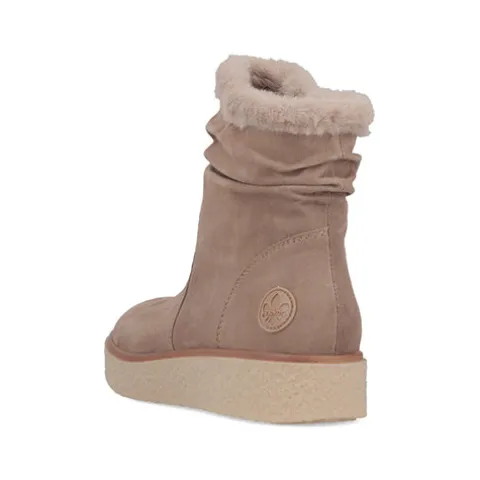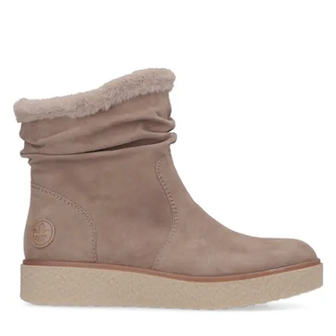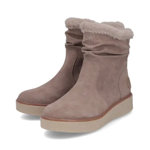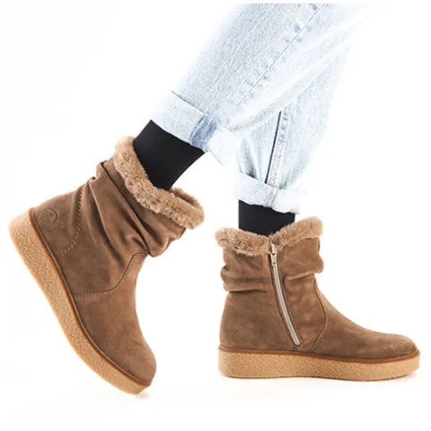 Smart vinterstøvle med en overdel af ruskind, som er rynket over anklen og dekoreret med en faux pelskant om åbningen. Støvlen lukkes med en lynlås på indersiden af anklen. Indvendig har støvlen et varmt foer, og den udtagelige indersål er polstret og komfortabel. Den stødabsorberende gummiydersål med en let kilehæl og plateausål giver et fint vejgreb.