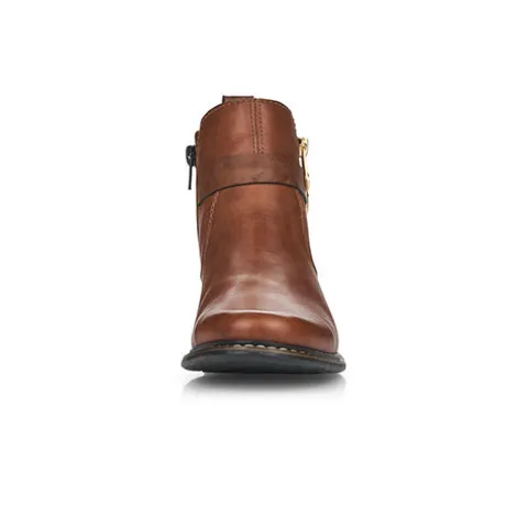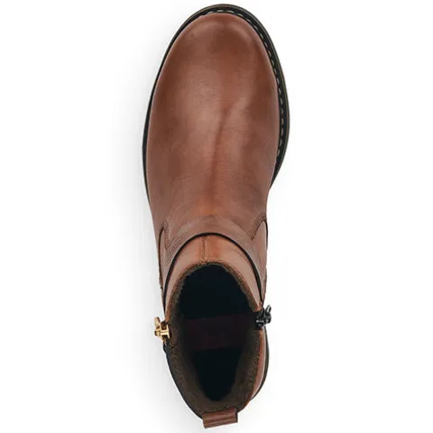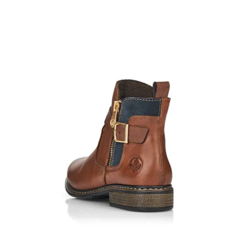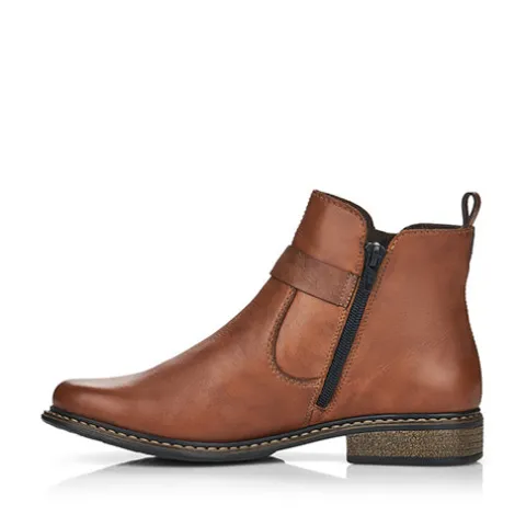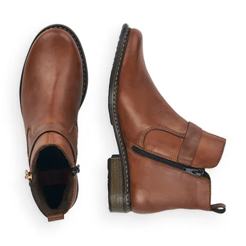 Flot ankelstøvle i læder fra Rieker i en fin brun farve. Støvlen har en indvendig lynlås og en pyntelynlås på ydersiden. Støvlen er foret med fleecefoer.