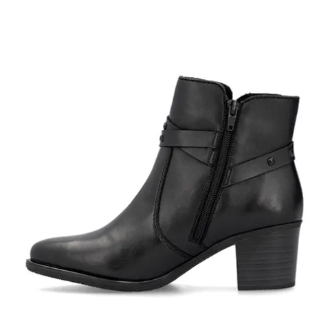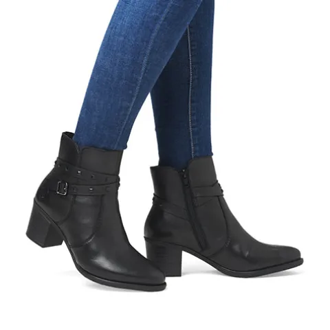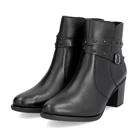 Let og fleksibel støvle med en overdel af glat skind, dekoreret med en rem om anklen med diskrete nitter og et pyntespænde. Støvlen lukkes med en lynlås på indersiden af anklen, og med komfortvidde er der ekstra plads om forfoden. Indvendigt er støvlen udstyret med et let fleecefoer samt en foret Antistress-sål, imens gummiydersålen er stødabsorberende med et fint vejgreb. Støvlen har et feminint look med den 6,5 cm høje blokhæl.