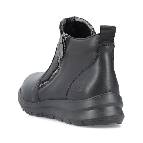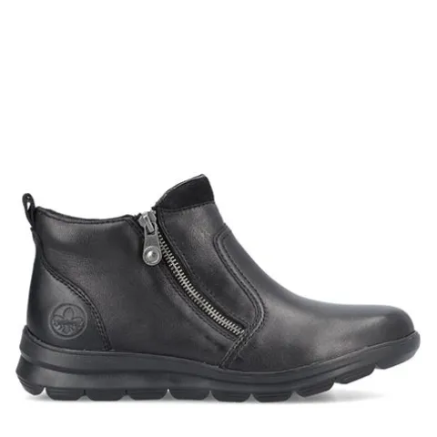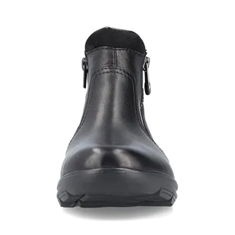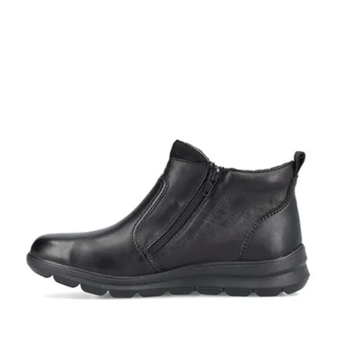 Lækker og let ankelstøvle til vintervejret. Overdelen er af glat skind med en syntetdetalje af imiteret skind på hælen, og indvendig har støvlen et varmt foer, der holder fødderne lune. Støvlen lukkes med en lynlås på begge sider af anklen, hvilket betyder, at støvlen kan åbnes helt op, så du nemt kan stikke foden i den, og en lille trækfane bagpå gør det endnu nemmere at træde i støvlen. Den udtagelige indersål er polstret, støddæmpende, åndbar og komfortabel, og den fleksible og kraftigt mønstrede gummiydersål er stødabsorberende med et godt fodfæste selv på våde og isede overflader.