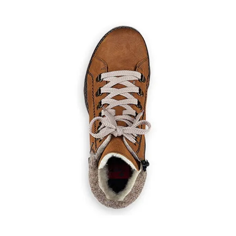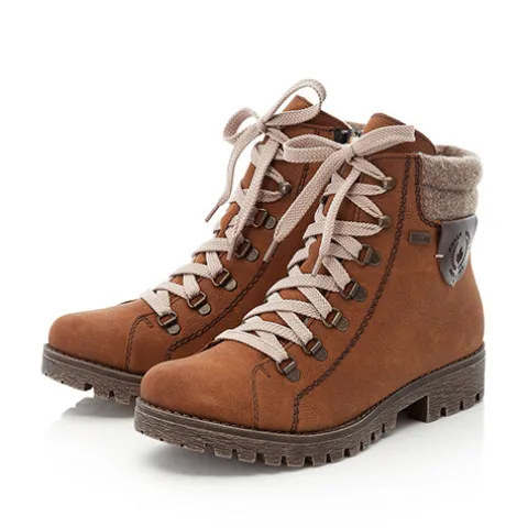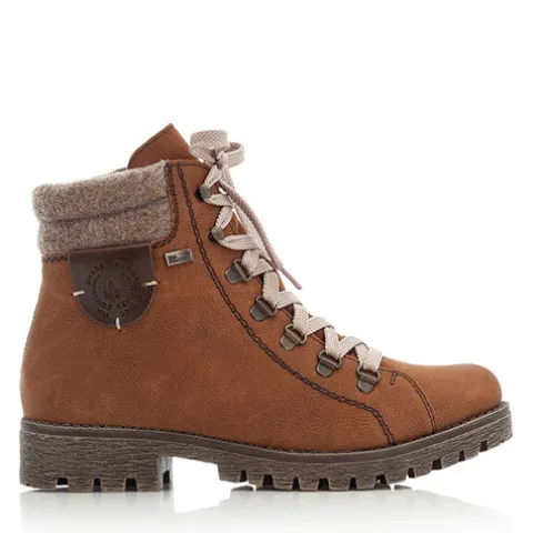 Dejlig vinterstøvle med en overdel af slidstærk syntet, dekoreret med en bred og polstret tekstilkrave samt en lap i læderlook med logo. Støvlen justeres med snørebånd og lukkes med lynlås på indersiden af anklen. Med komfortvidde er der mere plads om forfoden. Støvlen har en vandafvisende RiekerTEX-membran samt et varmt foer, så du er sikret varme og behagelige fødder. Indersålen er komfortabel, og den kraftige ydersål er stødabsorberende med et godt vejgreb.