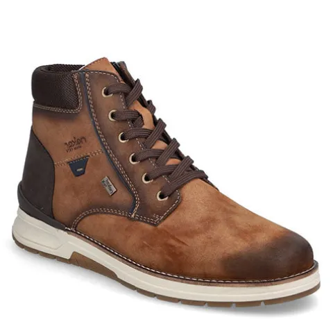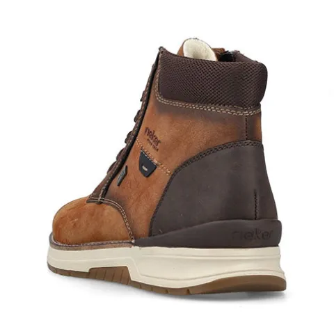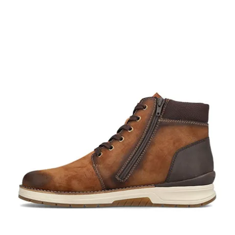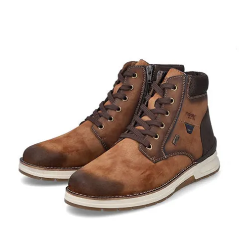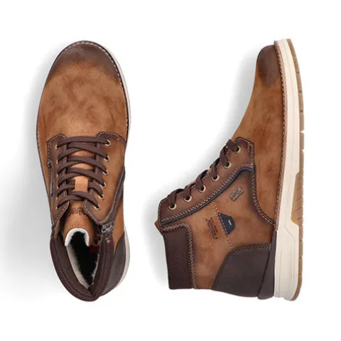Flot vinterstøvle med en overdel af syntet i nubuck-look foret med ny uld. Støvlen justeres med snørebånd og lukkes med en lynlås på indersiden af anklen. Åbningen er polstret for øget komfort, og en vandafvisende RiekerTex-membran holder fødderne behageligt tørre. Med vidde H er der god plads om forfoden. Indersålen kan tages ud, og ydersålen er stødabsorberende med et fint vejgreb.