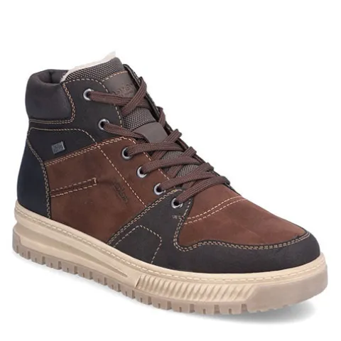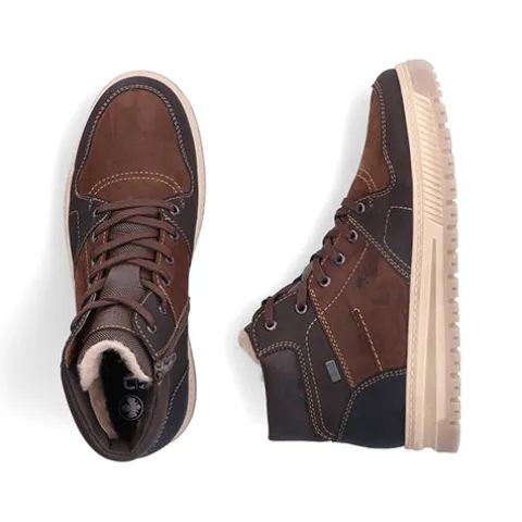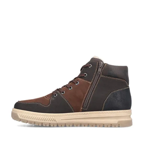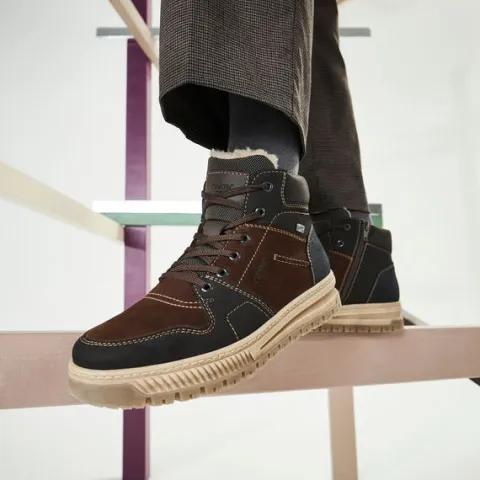 Lækker støvle med en overdel af nubuck og syntet, foret med varmt lammeuld. Støvlen justeres med snørebånd og lukkes med en lynlås på indersiden af anklen, og åbningen er polstret for øget komfort. Støvlen har ekstra vidde om forfoden, og en åndbar og vandafvisende Rieker tex-membran holder fødderne tørre. Antistress-indersålen er komfortabel, og den stødabsorberende ydersål giver et fint vejgreb. Flot ankelstøvle med kontrastsyninger i et sporty, flot design.