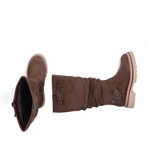 Flot langskaftet støvle med en overdel af blødt tekstil i et smart, rynket design, dekoreret med to spænder på ydersiden af henholdsvis skaftet og anklen. Støvlen lukkes med en lynlås på indersiden af benet. Indvendig har støvlen et blødt, let og lunt foer, og indersålen er komfortabel. Den kraftige ydersål har et godt mønster og er stødabsorberende med et godt vejgreb.