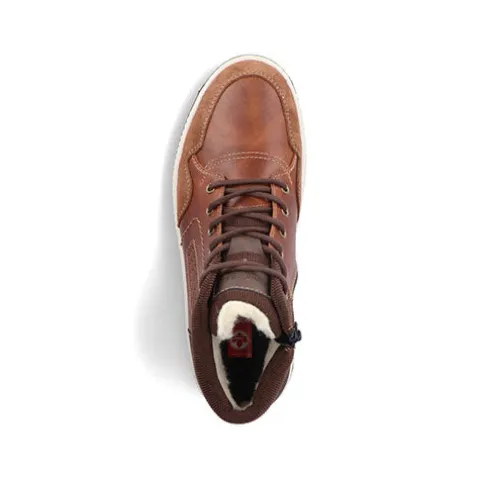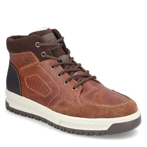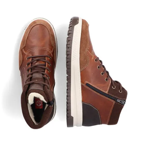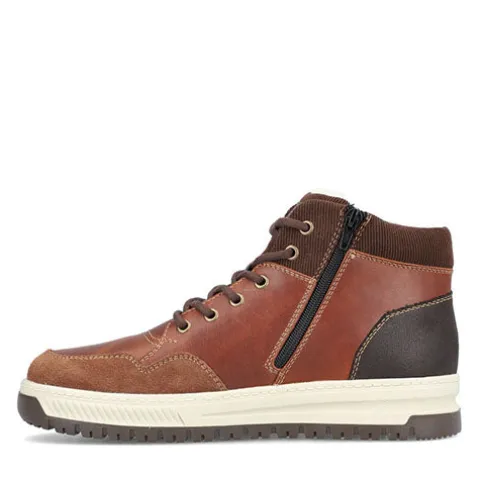Lækker og komfortabel ankelstøvle til vinterhalvåret. Overdelen er af glat skind og ruskind med tekstil på pløsen og den polstrede åbning, og RiekerTEX-membranen holder fødderne tørre, imens det varme foer holder dem lune. Støvlen justeres med snørebånd og lukkes med en lynlås på indersiden af anklen. Indersålen er foeret og blød, og ydersålen af gummi giver et godt fodfæste.