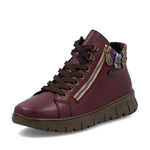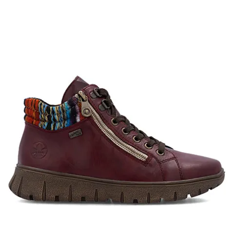 Lækker ankelstøvle med en overdel af glat skind og en flot krave af farverigt garn. Støvlen justeres med snørebånd og lukkes med lynlås på hver side af snørebåndet. Indvendig har støvlen et blødt, lunt foer, og sammen med en kraftigt vandafvisende Rieker-Tex-membran holdes fødderne lune og tørre. Med vidde H er der plads til den bredere fod. Den udtagelige indersål er støddæmpende og komfortabel, og den fleksible ydersål er stødabsorberende med et godt fodfæste.