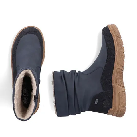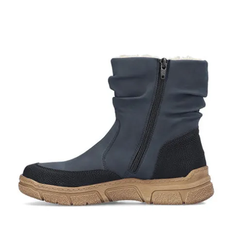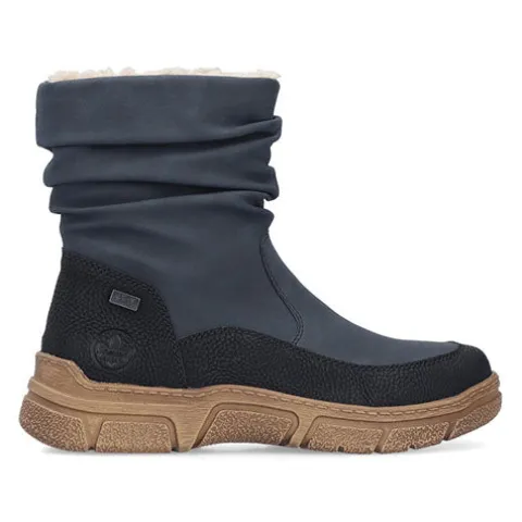 Dejlig vinterstøvle med et moderne rynket look. Overdelen er af syntet foret med et varmt foer helt ud i tåområdet, og sammen med en kraftigt vandafvisende RiekerTEX-membran holdes fødderne varme og tørre. Støvlen lukkes med en lynlås på indersiden af anklen. Med vidde H er der god plads til den bredere fod. Den udtagelige indersål er polstret, støddæmpende og komfortabel, og ydersålen er stødabsorberende med et godt fodfæste.
