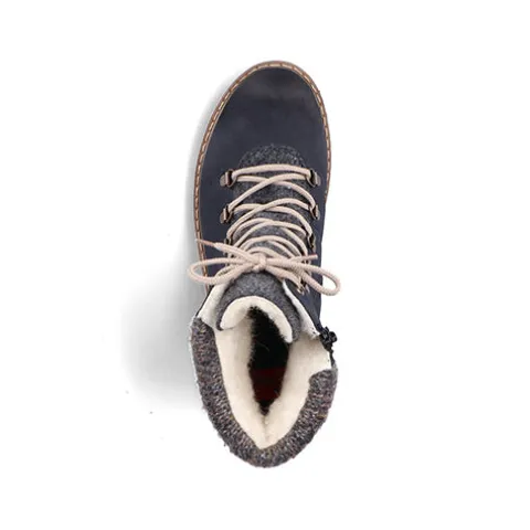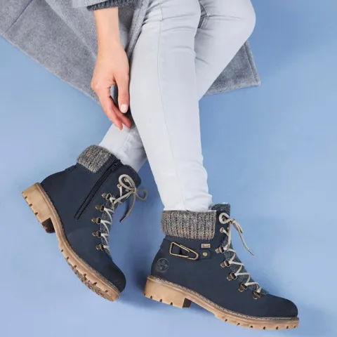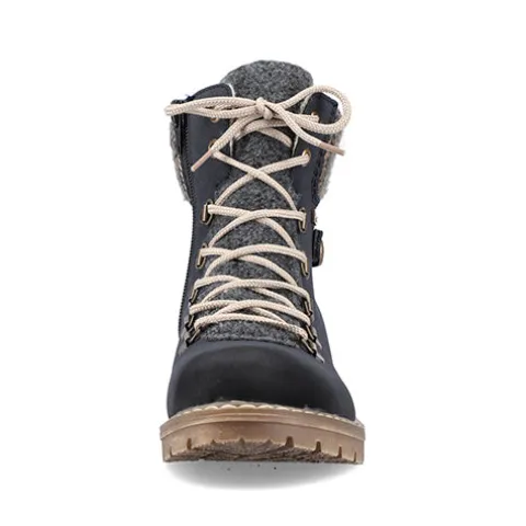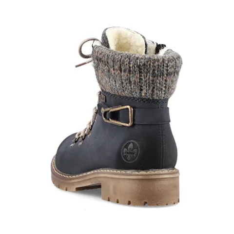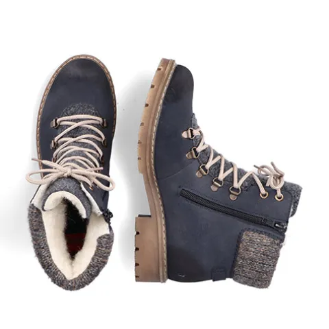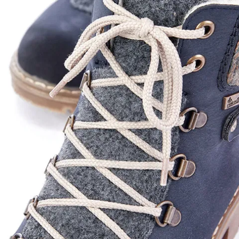 Dejlig vinterstøvle med en overdel af syntet i nubucklook med tekstil på pløsen og en bred og polstret strikket krave om åbningen. Ydersiden af hælen er dekoreret med en rem med pyntespænde. Støvlen justeres med snørebånd og lukkes med en lynlås på indersiden af anklen. Rieker-TEX gør støvlen vandafvisende, åndbar og vindtæt, og det varme foer holder fødderne lune. Indersålen er blød og komfortabel, og den kraftige ydersål er stødabsorberende med et godt vejgreb.