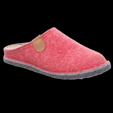 Flot hjemmesko fra Rohde med en overdel af filt dekoreret med en læderlap med logo foldet om kanten af åbningen. Den polstrede og komfortable indersål af skind kan tages ud, og ydersålen er belagt med gummi og giver dermed et godt fodfæste.