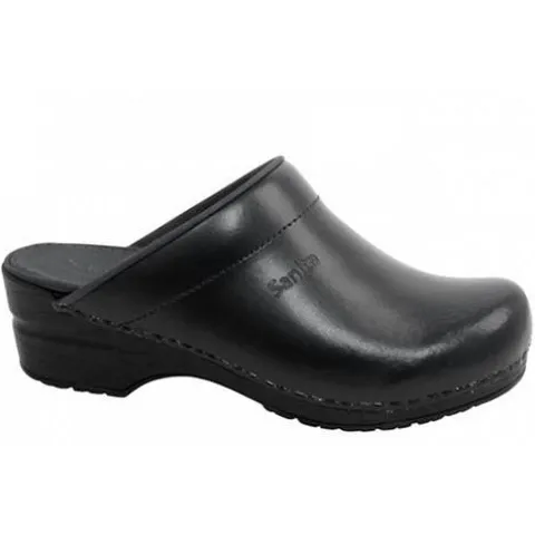 Åben træsko fra Sanita med PU-flexsåler. Overdelen er lavet i kraftig skind.