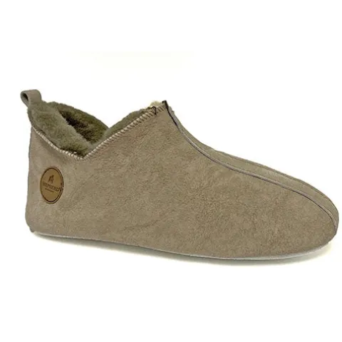 Lækker hjemmesko med hælkappe og trækfane. Overdelen er af nubuck med detaljer af ruskind, og ydersålen er af ruskind. Indvendig har hjemmeskoen et tykt foer af uld.