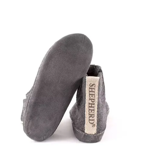 Shepherd Stina er et par varme og behagelige hjemmesko i uld med en lille snip bagpå. Disse ankelhøje tøfler har en elastisk slids i siderne. Indersål i blødt uld. Ydersål i børstet ruskind.