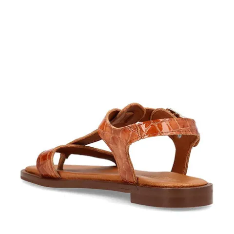 Flot Evita sandal med en overdel af lakeret skind med krokodillepræg. Sandalen har tårem og lukkes med en ankelrem med spænde. Den polstrede og komfortable dæksål er beklædt med skind, og ydersålen er fleksibel.