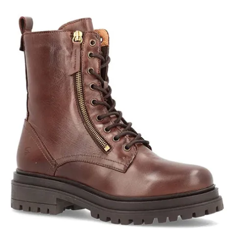 Lækker Smilla vinterstøvle med en overdel af glat skind dekoreret med en pyntelynlås på ydersiden langs med snørebåndet. Støvlen justeres med snørebånd og lukkes med en lynlås på indersiden af anklen, og en trækfane dekoreret med en metalknap gør det nemt at træde i støvlen. Indvendig har støvlen et varmt foer af 100 % uld. Den chunky ydersål er stødabsorberende med et godt vejgreb. Støvlen er mørkere end på billederne.