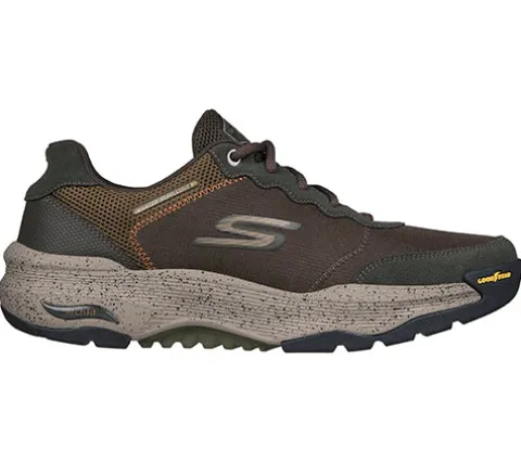 Lækker Go Walk Arch Fit Outdoor Poalite Rock snøresko. Overdelen er et miks af åndbart tekstil og slidstærkt ruskind med en forstærkning af slidstærk syntet på hælen. De kraftige snørebånd er runde, og et praktisk hul til fingeren på hælen gør det nemt at træde i skoen, som med Scotchgard Protector 3M er varigt vandafvisende og nemmere at rengøre. Åbningen er polstret for øget komfort, og den udtagelige Air-Cooled indersål er komfortabel og har svangstøtte. Den grove GoodYear Performance ydersål af slidstærkt gummi giver en optimal trækkraft på de fleste overflader samt øget stabilitet qua et rigtig godt fodfæste.