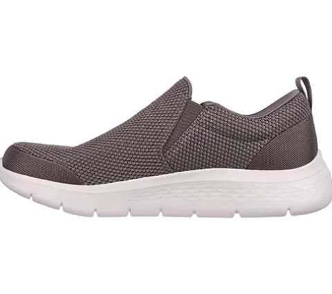 Komfortabel og fleksibel Go Walk Flex Impeccable II sko fra Skechers i en spændende khaki farve. Overdelen er af tekstil, og der er isat en kile af elastik på begge sider ved åbningen, der gør det nemmere at træde i skoen. Det gør trækfanen på hælen også. Åbningen er polstret for øget komfort, og modellen har en Air Cooled Goga Mat indersål, som giver en high-rebound og åndbar stødabsorbering. Letvægtsmellemsålen har responsiv Ultra Go Cushioning, og ydersålen har Flex Pillars-riller i fuld længde på tværs af foden, som øger fleksibiliteten. Kan maskinvaskes ved max 30 grader og skal lufttørres.