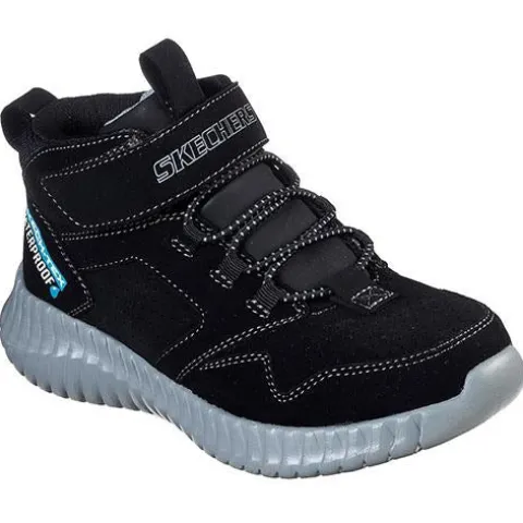 Sort vandtæt Skechers støvlet med velcro og elastik. Støvlen har en praktisk grå sål og AirCooled MemoryFoam.