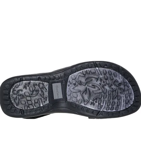 Lækker Reggae Slim – Coffee Run sandal med en blød Stretch Fit®-overdel af tekstil og syntet. Sandalen lukkes med en velcrorem over vristen, og det flotte elastikdesign over forfoden og vristen lader sandalen tilpasse sig foden i løbet af dagen. Hælremmen har en pude for ekstra komfort. Den polstrede Skechers Memory Foam®-dæksål er komfortabel, imens Reggae-letvægtsmellemsålen er fleksibel og stødabsorberende. Gummiydersålen er også fleksibel og stødabsorberende og giver et godt fodfæste. Sandalen kan maskinvaskes ved maks. 30 grader. Er fremstillet af 100 % veganske materialer.