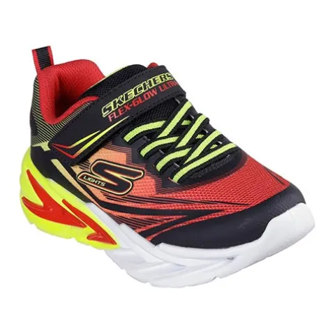 Flot S Lights Flex – Glow Ultra sko med blinkende lys på ydersålen. Overdelen er af ombre meshtekstil med syntetbelægning, og skoen lukkes med en velcrorem over vristen, imens en ikkejusterbar elastiksnøre sørger for tilpasning til foden i løbet af dagen. En trækfane på hælen gør det nemt at træde i skoen, og åbningen er polstret for øget komfort og beskyttelse. Indersålen er komfortabel, og ydersålen er stødabsorberende.