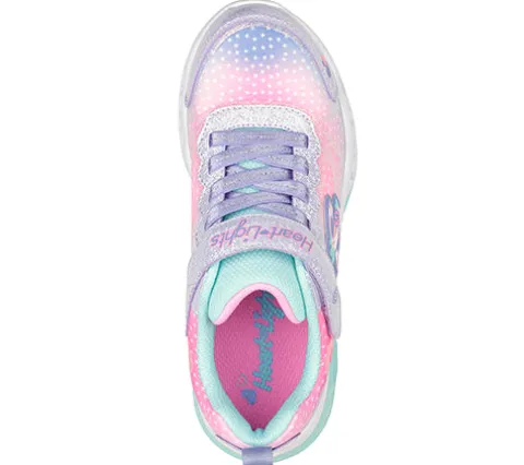 Frisk S Lights Flutter Heart Lights – Simply Love sko med blink. Overdelen er af åndbart mesh-tekstil med slidstærke syntetdetaljer på bl.a. snuden, hælen og ved elastiksnøren. Skoen har ikkejusterbar elastiksnøre og lukkes med en velcrorem, og en trækfane på hælen gør det nemt at træde i skoen, som har en polstret åbning for øget komfort. For enden af velcroremmen sidder en tænd/slukknap til det blinkende lys. Indersålen er polstret og komfortabel, og den stødabsorberende mellemsål lyser op med blink, der ses fra både yder- og indersiden, da lysene sidder i hjerteformede, gennemgående huller. Den fleksible ydersål giver et fint fodfæste.