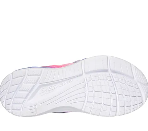 Frisk og farverig S Lights – Rainbow Cruisers sko med en vævet tekstiloverdel i mørkeblå, lilla og pink med ombre-effekt. Skoen lukkes med en velcrorem over vristen og har en ikkejusterbar elastiksnøre, så skoen tilpasser sig foden i løbet af dagen. Trækfane på både hæl og pløs gør det nemt at træde i skoen, som har en komfortabel indersål. På ydersiden af ydersålen er der blink i regnbuens farver, og for enden af velcroremmen sidder en tænd-/slukknap. Den fleksible ydersål er stødabsorberende og giver et godt vejgreb.