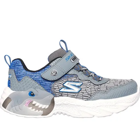 Flot S Lights Creature-Lights sko med blink. Overdelen er af tekstil med slidstærke syntetdetaljer, og skoen lukkes med en velcrorem over vristen, imens en ikkejusterbar elastiksnøre sørger for tilpasning til foden i løbet af dagen. For enden af velcroremmen sidder en tænd-/slukknap. Indersålen er komfortabel, og den stødabsorberende ydersål er dekoreret med en haj med blink.